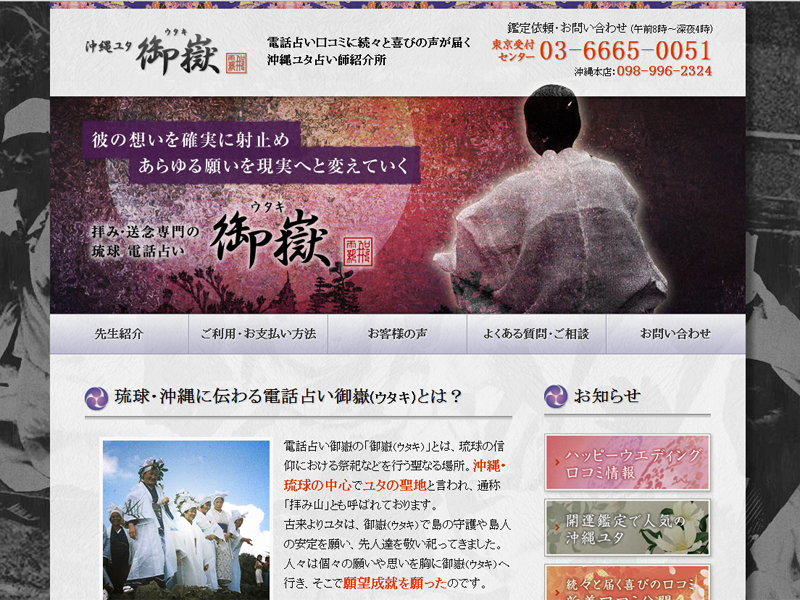 沖縄ユタの御嶽では、琉球の祭祀などが行われるユタの聖地で行われている占いを電話で全国各地のお客様に利用してもらうことが出来るサービスを展開しています。現在、電話占いの口コミで続々と喜びの声が届いている御嶽の占いを試してみてはいかがでしょうか?所属している占い師の先生も沖縄在住の実力者のみとなっています。